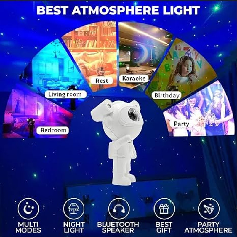 With its adorable astronaut design, this galaxy light projector adds a creative and modern touch to bedrooms, kids’ rooms, gaming setups, or relaxation spaces. Easily control brightness, colors, rotation, and lighting modes using the included remote control or the built-in buttons.