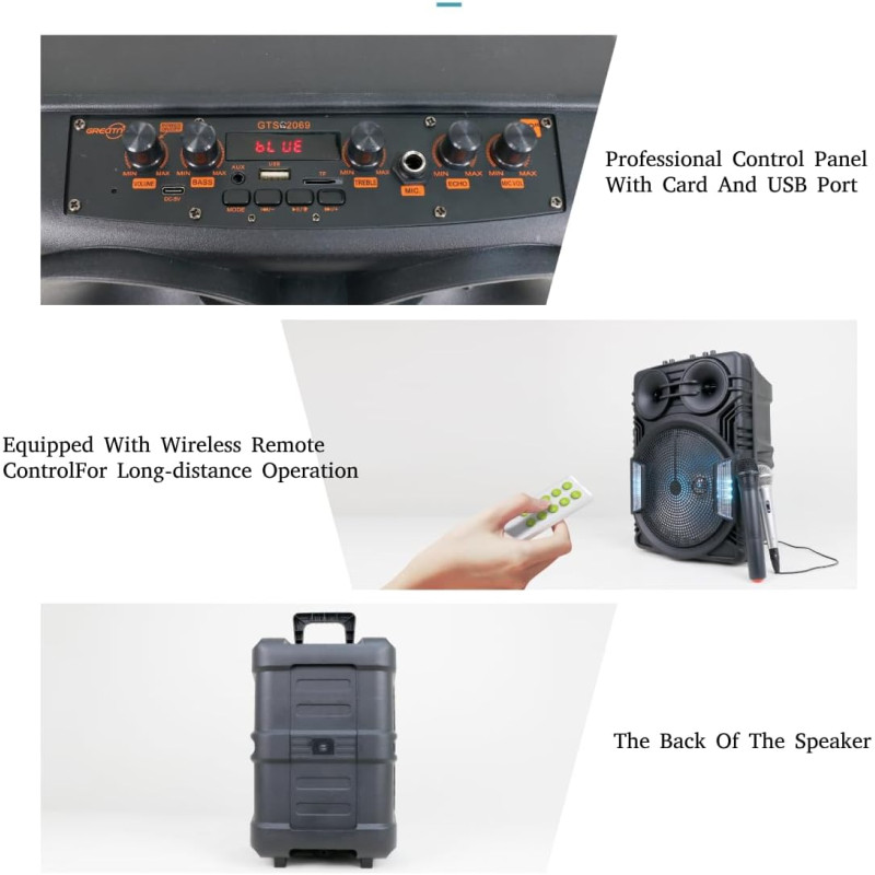 With Bluetooth 5.3 connectivity up to 10 meters, it supports USB, SD, TF card, FM radio, AUX input, and comes with a remote control and wireless microphone for a complete karaoke experience. Powered by a 2400mAh rechargeable battery, the GTS-2069 ensures hours of music playback anywhere you go. Ideal for indoor or outdoor use, this speaker combines portability, power, and fun in one device.