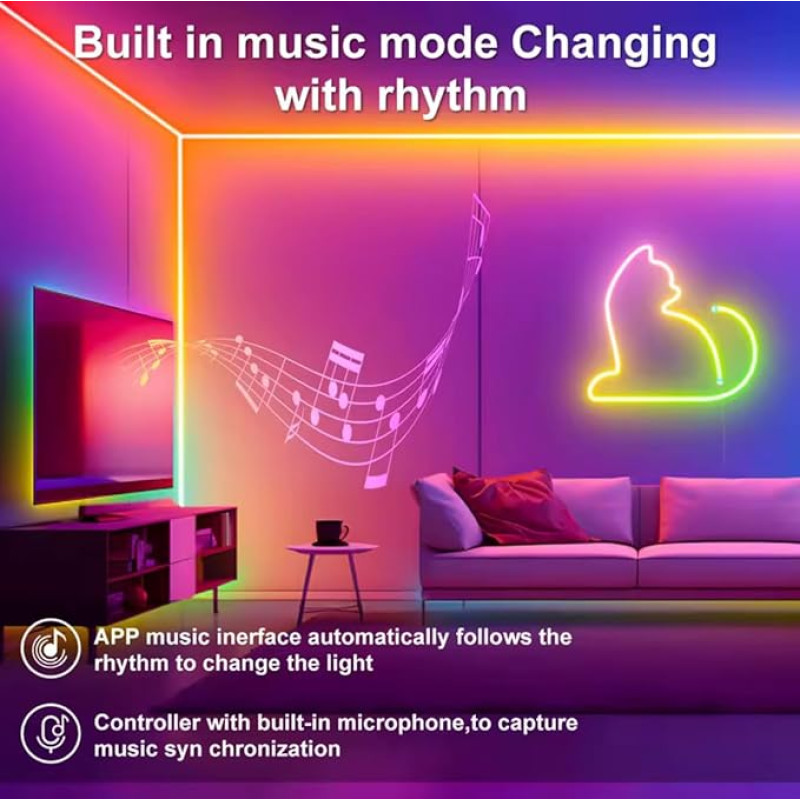 With 60+ dynamic lighting effects, music sync mode, and full control via smart mobile app or remote control, you can easily customize brightness, colors, speed, and scenes to match your mood or music. The strip reacts in real time to sound, making it perfect for gaming, movie nights, and parties.