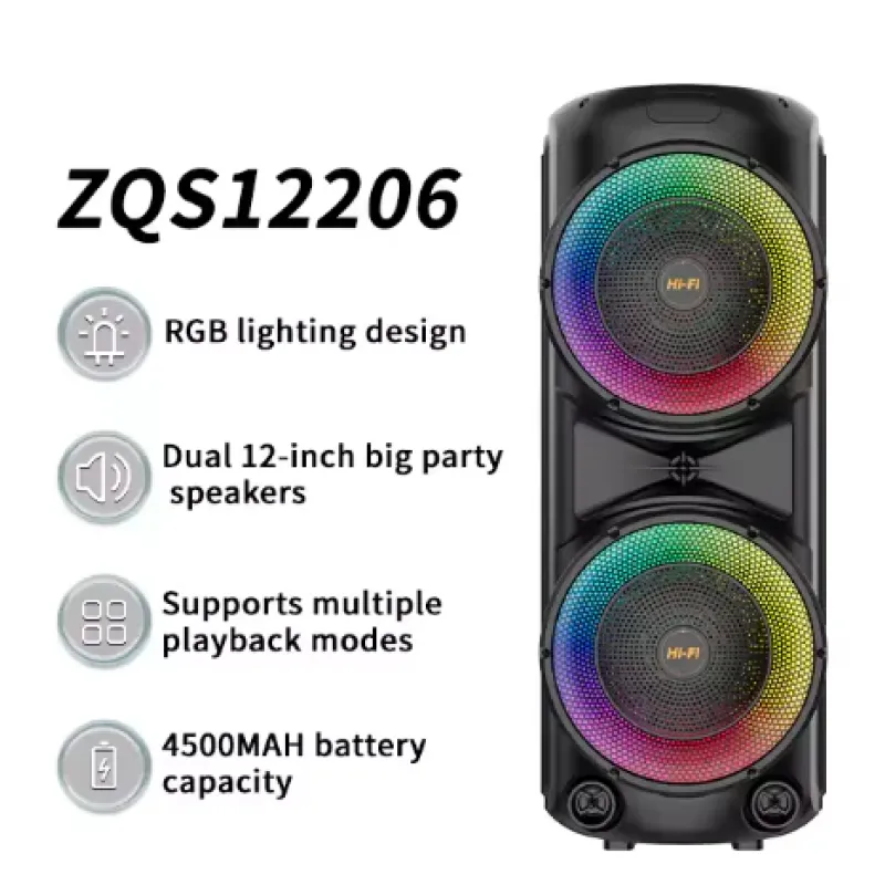 With Bluetooth connectivity, USB, TF card, FM radio, and AUX input support, you can enjoy music from multiple sources. Its portable tower design and built-in rechargeable battery allow you to take the party anywhere. Perfect for karaoke nights, celebrations, or home gatherings, the ZQS-12206 brings high-impact sound and style together.
