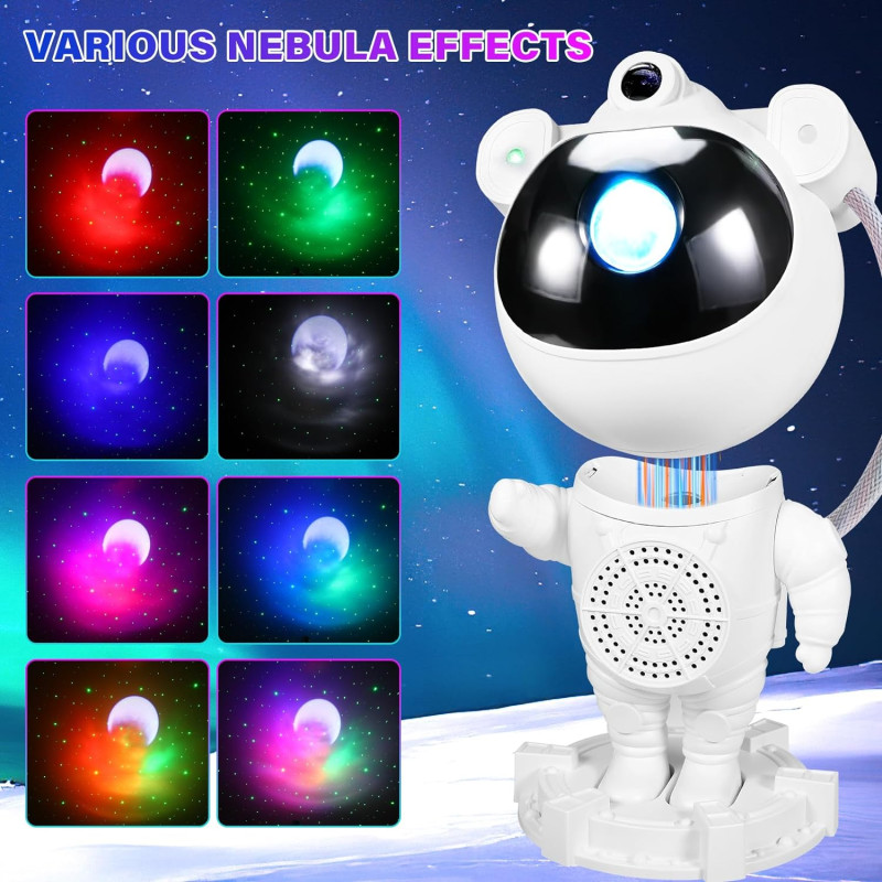 Create a dreamy and relaxing atmosphere with the Star Projector Astronaut with Bluetooth Speaker, a multifunctional galaxy projector designed to transform any room into a magical space experience. This advanced projector displays stunning galaxy effects with a glowing moon, offering up to 17 unique light combinations that fill your space with colorful nebula patterns and starry skies.